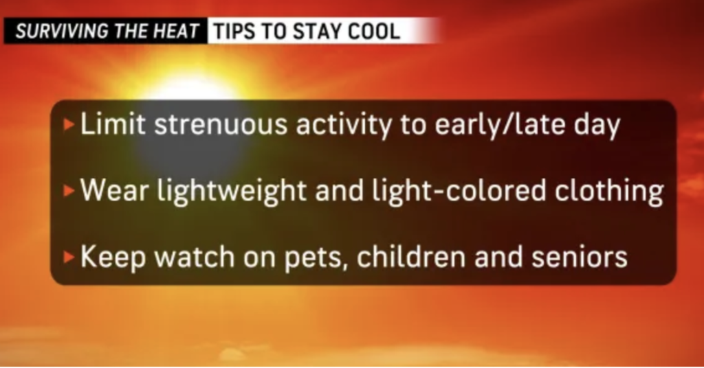 Our intense heat wave continues making today an official heat wave with 3 days of 90 degrees or higher, marking the highest temperatures since last summer and potentially in several years, both duration and humidity levels. Today an extreme heat warming until 8PM tonight with heat index values up to 107 expected. The high today 102 will break the record of 95 degrees set in 2013. Consume an ample amount of fluids, in an air-conditioned environment, avoid direct sunlight, and monitor the well-being of relatives, neighbors, and pets. Never leave young children or pets unattended in vehicles, as car interiors can reach fatal temperatures within minutes. Prioritize staying cool, hydrated, and informed.