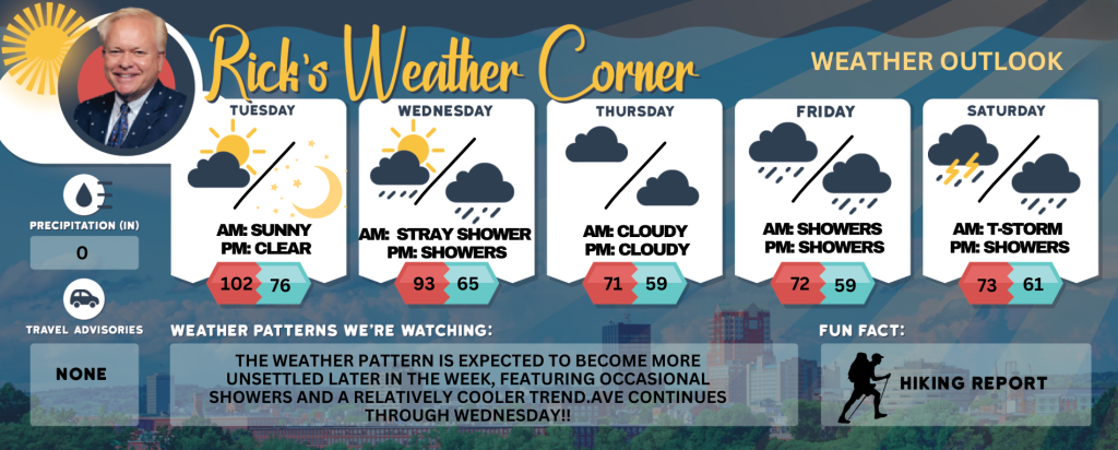 Today: Predominantly sunny extremely hot and muggy with temperatures surpassing the record of 95 degrees set in 2013; precautions are recommended for prolonged outdoor activities. High 102 (feel like 107) Winds: WNW 5-15 mph