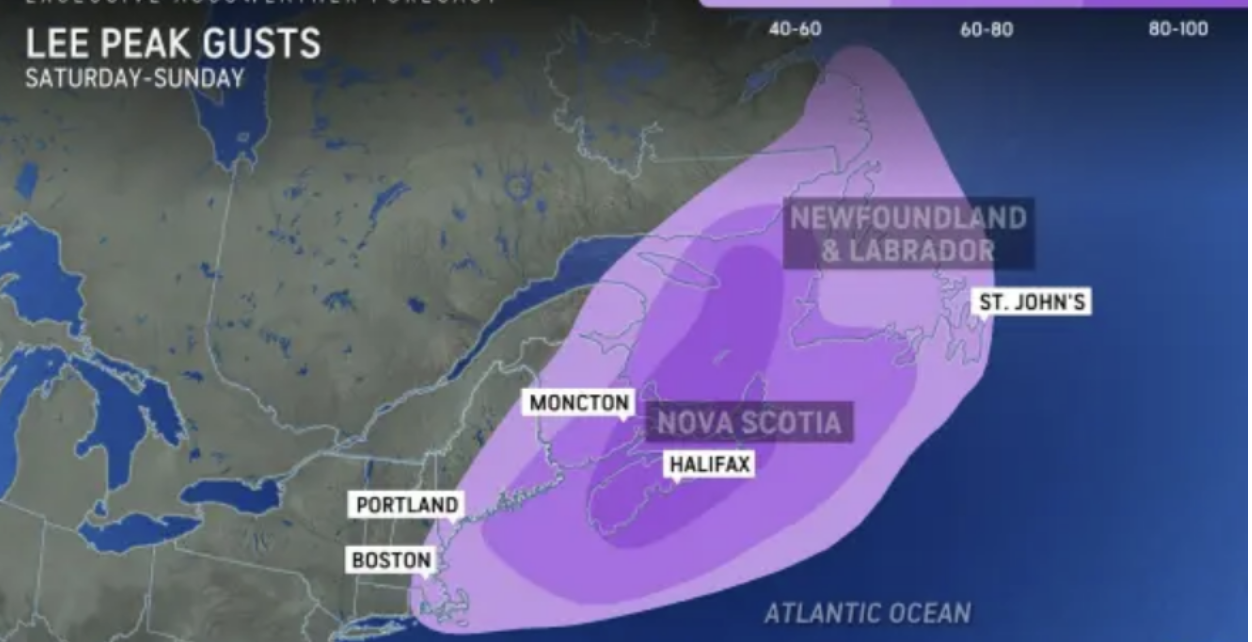 Weekend peak wind gusts from Lee ranging from 40-60 mph will be possible from Cape Cod, Massachusetts, Coastal New Hampshire to parts of Newfoundland and Labrador, with winds blowing upwards to 80-100 mph where the storm can make landfall across areas of southern Nova Scotia.