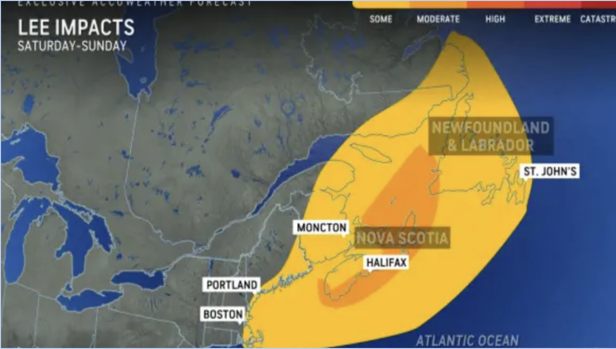 Primary impacts from Lee from southeastern Massachusetts, coastal New Hampshire on northeastward through Nova Scotia, and areas of Newfoundland and Labrador.
