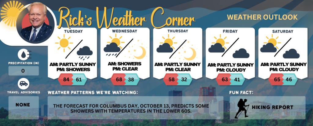The forecast for Columbus Day, October 13, predicts some showers with temperatures in the lower 60s.