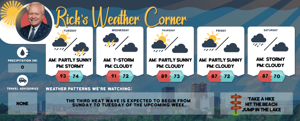 Today: Expect a hot day with periods of sunshine followed by cloud cover, and a chance of isolated thunderstorms in the afternoon. A few storms may be severe. There is a potential risk of dehydration and heatstroke during vigorous activities. High 93 (feel like 99) Winds: SW 10-15 mph
