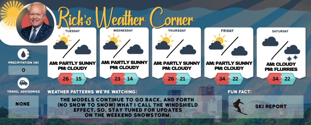 Today: Windy (gusts up to 45 mph) with sun & clouds. High 26 (feel like 10) Winds: NW 20-30+ mph
