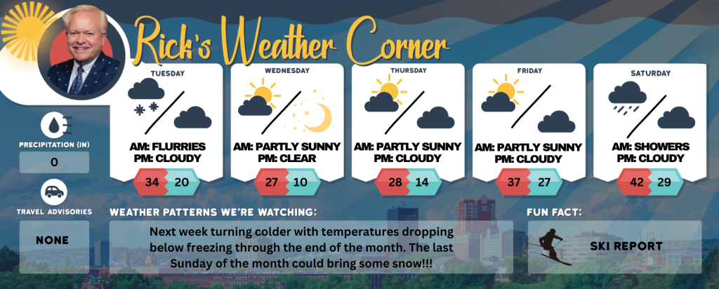 Next week turning colder with temperatures dropping below freezing through the end of the month. The last Sunday of the month could bring some snow!!!