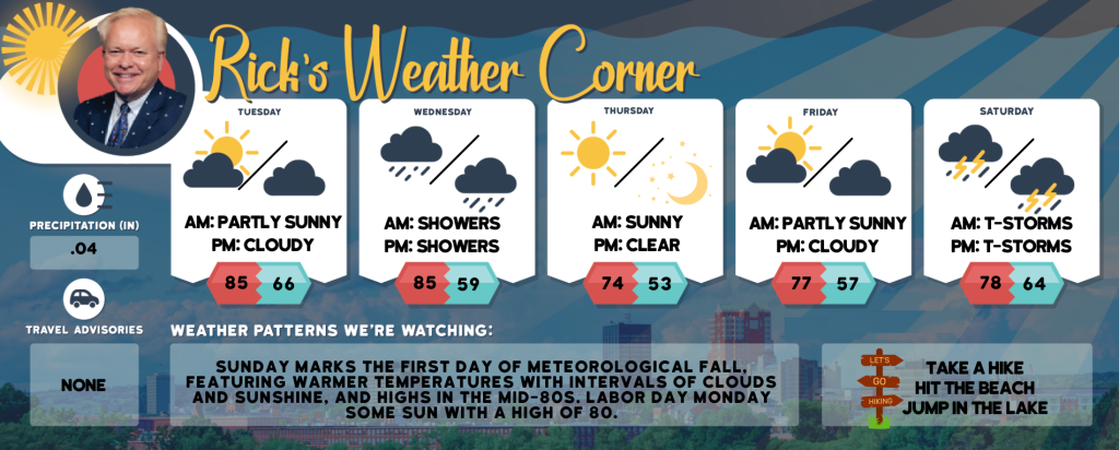 Sunday marks the first day of Meteorological Fall, featuring warmer temperatures with intervals of clouds and sunshine, and highs in the mid-80s. Labor Day Monday some sun with a high of 80.