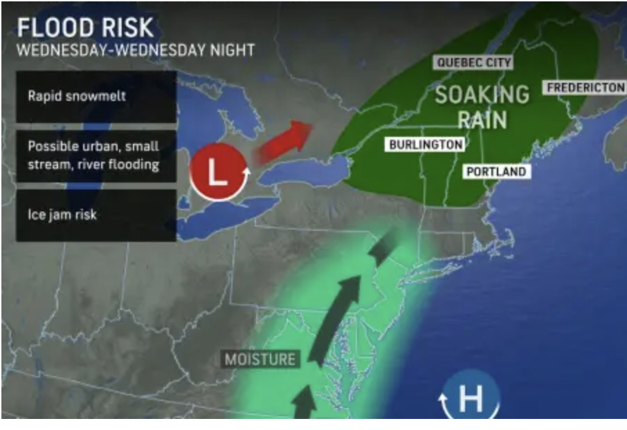 Early March storm to increase flood risk in New England. Temperatures are expected to rise, heavy rain will occur, and significant snowmelt in New England may increase the risk of flooding in the middle of the first week of March.