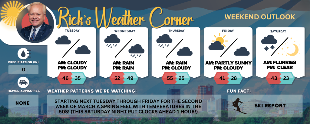 Starting next Tuesday through Friday for the second week of March a spring feel with temperatures in the 50s! (This Saturday night put clocks ahead 1 hour!)
