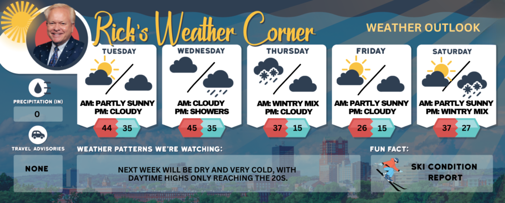 Wednesday: Cloudy & mild. High 45 (feel like 42) Winds: SSW 5-10 mph