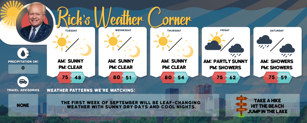 The weather for next week is expected to be dry but cool, with a fall-like feel with highs in the lower 70s.