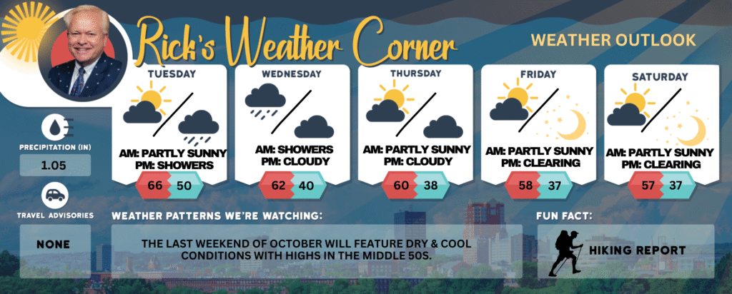 The last weekend of October will feature dry & cool conditions with highs in the middle 50s.