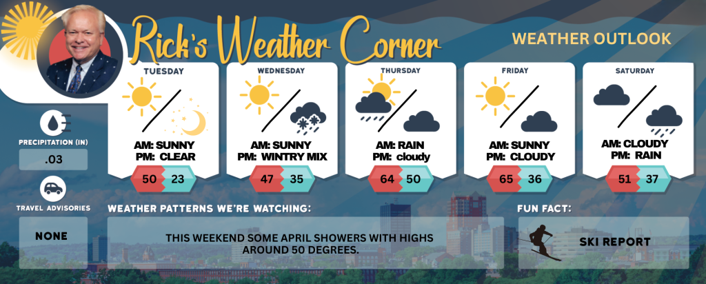 Today, for the first day of April, will be a mostly sunny day, but don’t forget to hold onto your hats! With brisk northwest winds gusting at 20-25+ mph, it’s going to feel a bit cooler—highs will reach around 50 degrees, but it may only feel like 43. Perfect weather for a refreshing walk, just make sure to hold onto the hat!