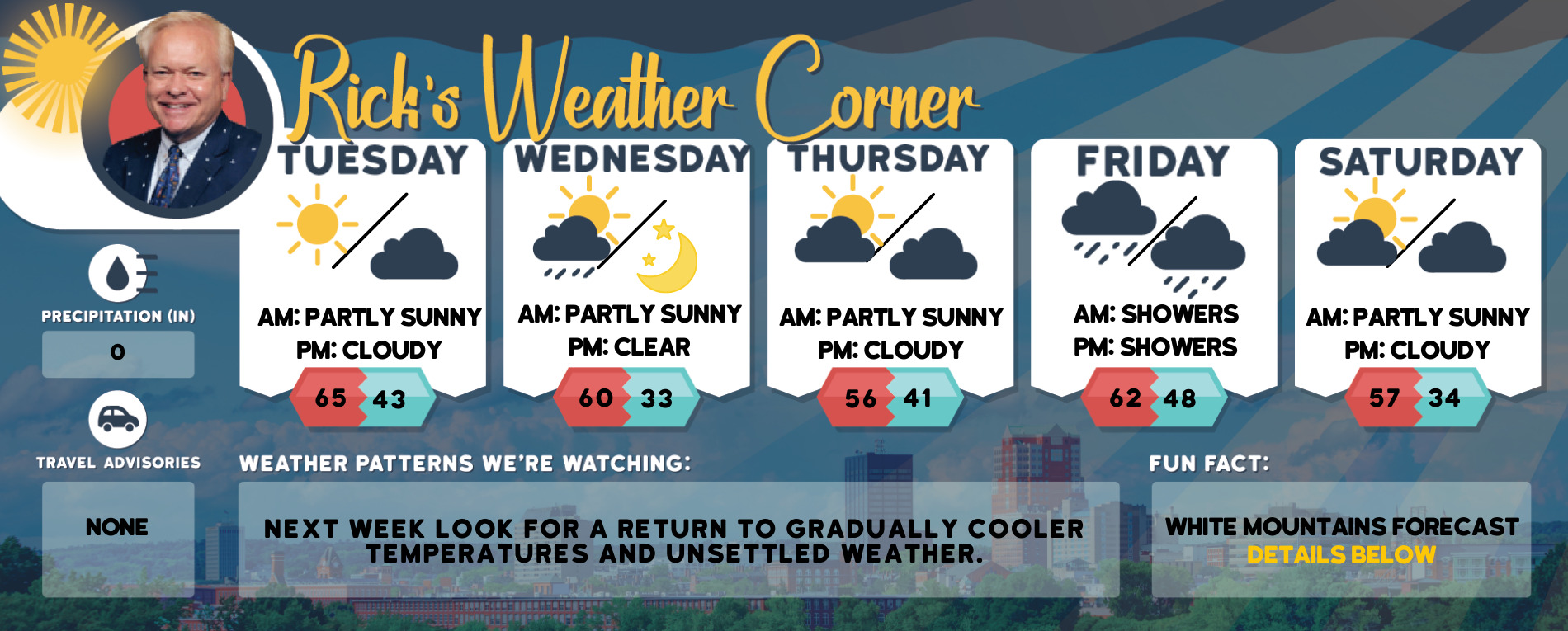 Next week look for a return to gradually cooler temperatures and unsettled weather.