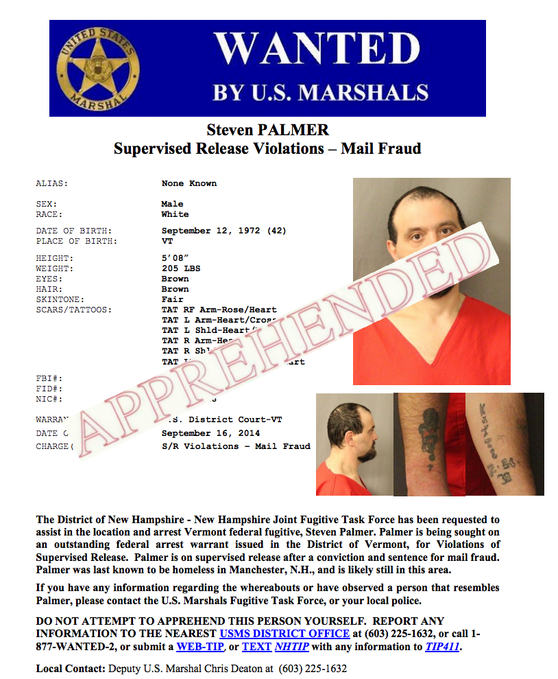 Palmer was also and was wanted out of Vermont on a federal arrest warrant issued for Supervised Release Violations, stemming from an original criminal case for mail fraud.