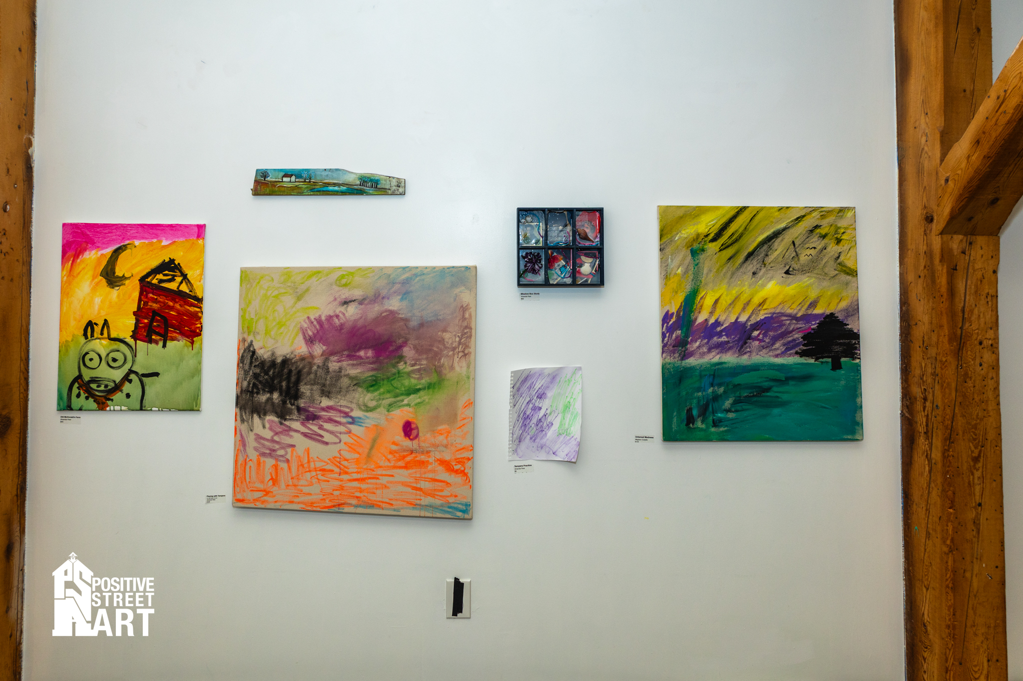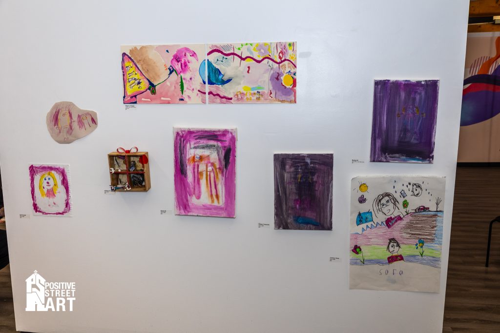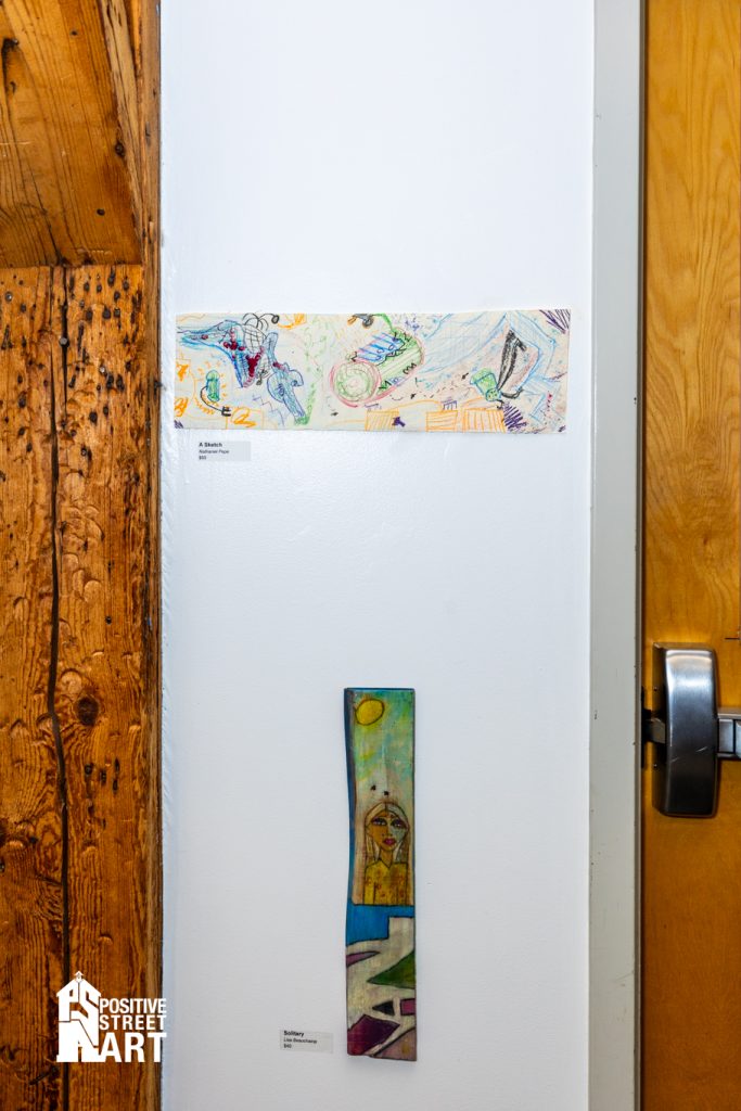 Amara Phelps, work also featured in the show, struck through her wall label with โS-O-L-Dโ in a purple marker. Amara, Yasmin Safarzadeh (curator), and plenty of staff from the Opportunity Networks would meet weekly for the preceding months in a studio space all their own at Positive Street Art in Nashua. Guided by their peers, but mostly themselves, they would assemble a body of work. Studies in concept, figure, form, and display were practiced, some galleried but none wasted. On a far table by the pizza was a mound of progress sketches, sold in affordable pairs. Not quite everything made it to the wall, but almost everything that did likewise made its way out the door.