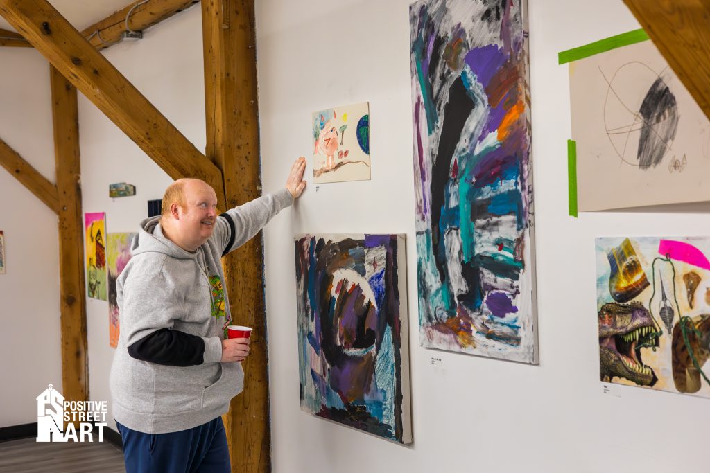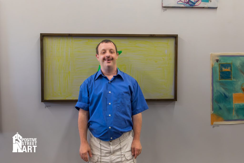 Some disabilities were seen, some not. But all reveled in their unadulterated expression of what they loved. I was invited to come to the last day of studio time to chill with the artists and make art myself. Just two days before the show, they were finishing turning their studio space into their gallery. Painterโs tape was lifted from all edges and all surfaces and each panel was readied for aesthetically dialed in viewing and display. Some were pushed beyond their comfort level to claw at something they thought was beyond their grasp. Most found out they were already naturally adept and their years of experience means that their skills sets are already at the level of professional art making. Especially for people like Liz Morin and Teddy Theos.