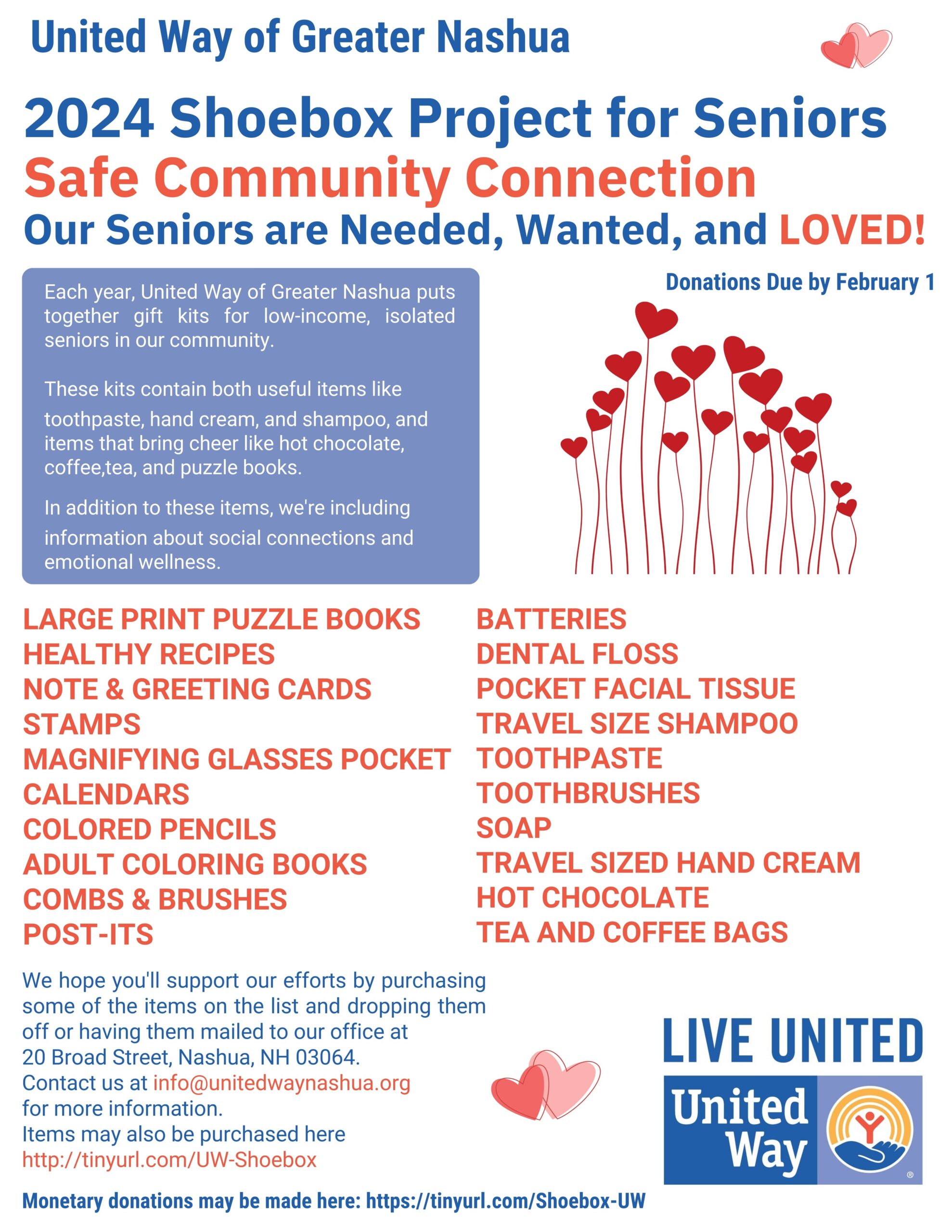 All items should be sent or dropped off at United Way, 20 Broad Street, Nashua, NH 03064, between 9 a.m. and 4 p.m. weekdays, no later than February 2. Thank you for your support of United Way’s work in the community!