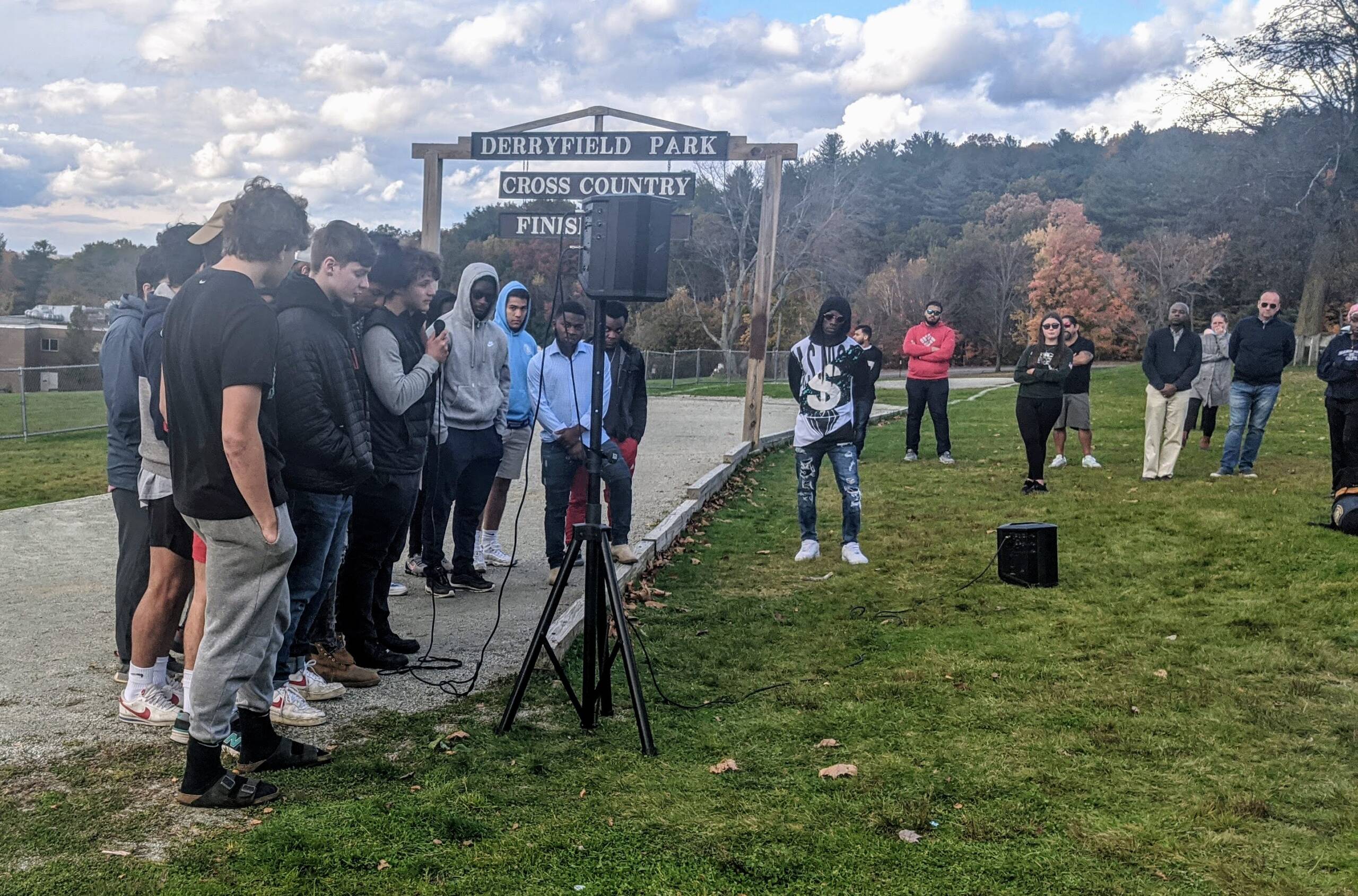 He described a “wall of fame” in his classroom where he hangs photographs of his new American students who have achieved athletically and academically. “There are so many who have done so well,” he said. “I could also have a wall of tragedy. Too many of our students who’ve gotten into big trouble or lost their lives,” O’Neil said. “That stuff has to stop. We here can do something about it,” he said, inviting Thamba’s teammates from Central soccer to come up and remember their friend.