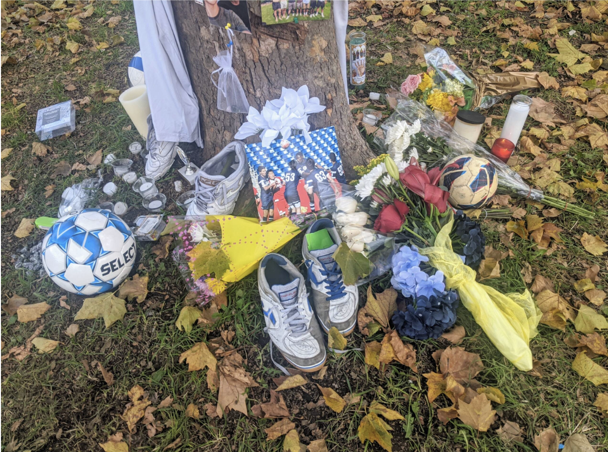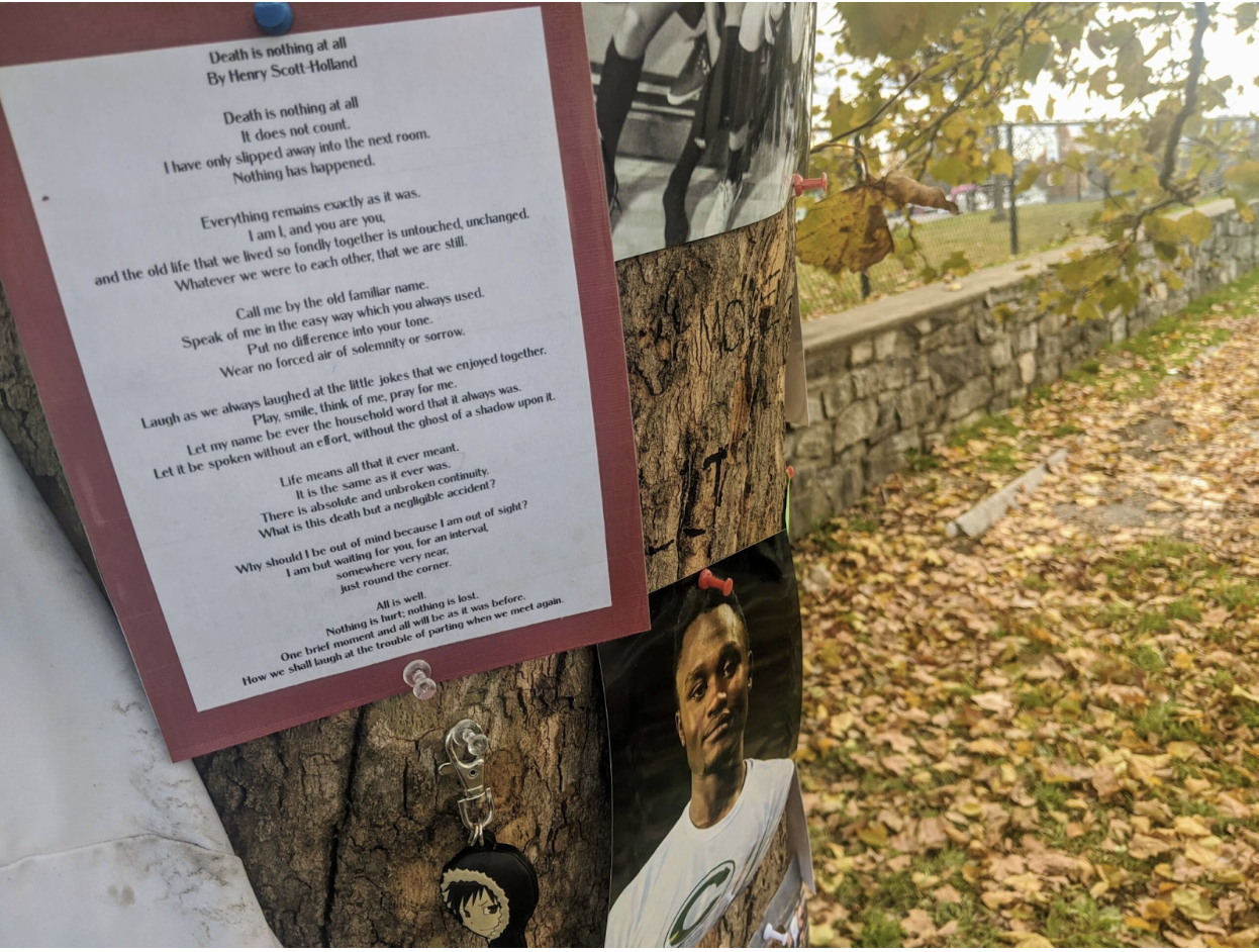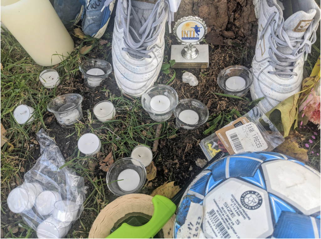 His friends and family created a makeshift memorial on and around a maple tree near where Thamba’s body was found Sunday morning. There were photographs and poems, messages and mementos. A small trophy from Inti Academy soccer program; two pair of well-worn sneakers;  signed Central jerseys; soccer balls; candles, bouquets. Someone wrote that they will finish the dream he never got to, which was to play professional soccer, and said that they would take care of his family. Another person wrote “RIP Bro – je t’aime, mon frรจre,” I love you my brother, in French.
