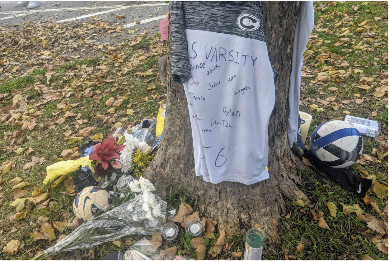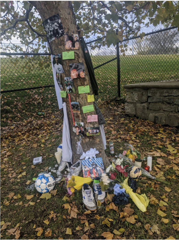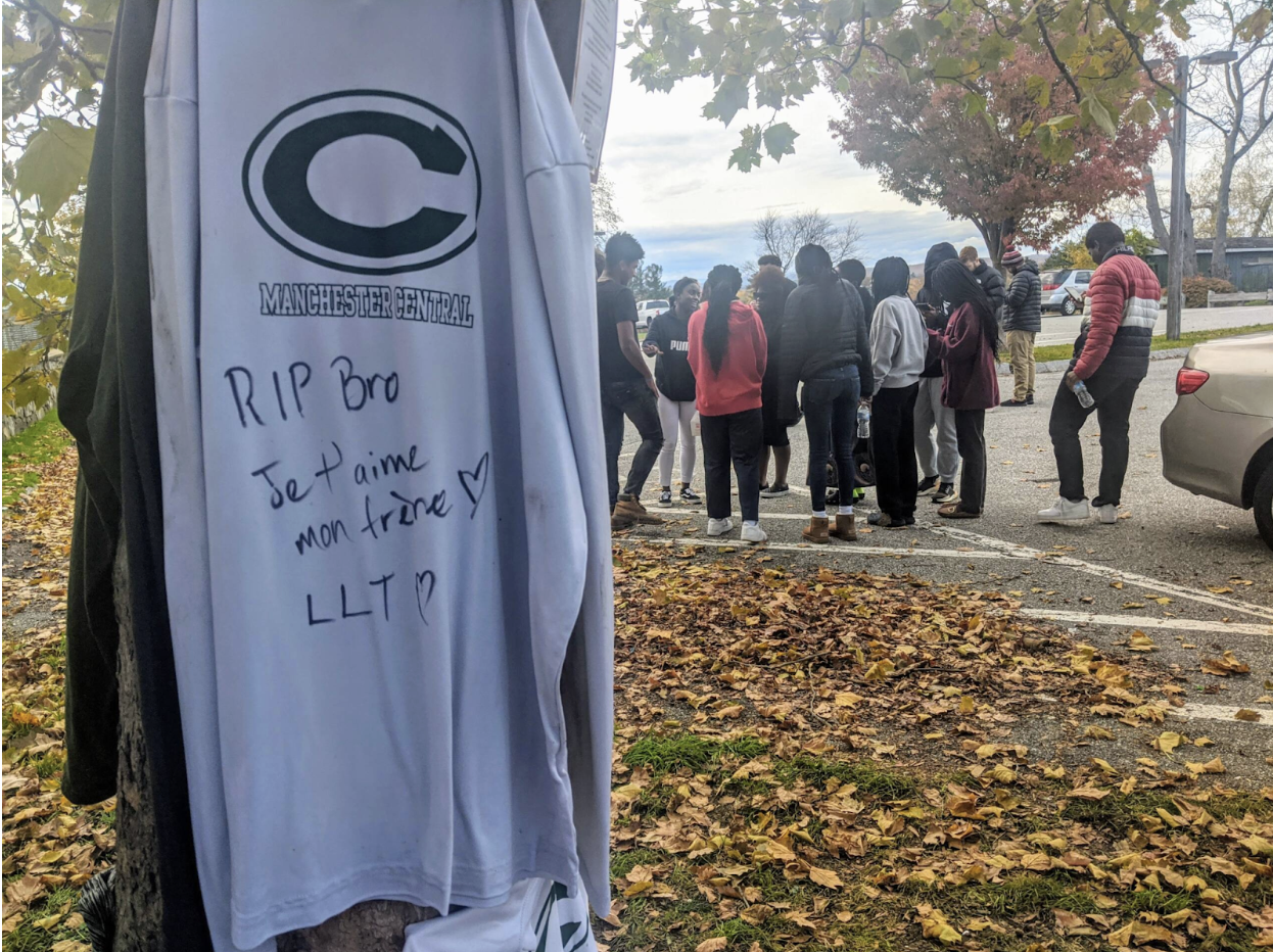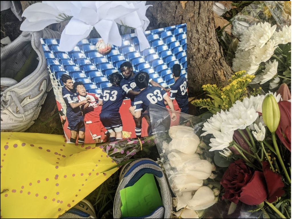 His friends and family created a makeshift memorial on and around a maple tree near where Thamba’s body was found Sunday morning. There were photographs and poems, messages and mementos. A small trophy from Inti Academy soccer program; two pair of well-worn sneakers;  signed Central jerseys; soccer balls; candles, bouquets. Someone wrote that they will finish the dream he never got to, which was to play professional soccer, and said that they would take care of his family. Another person wrote “RIP Bro – je t’aime, mon frรจre,” I love you my brother, in French.