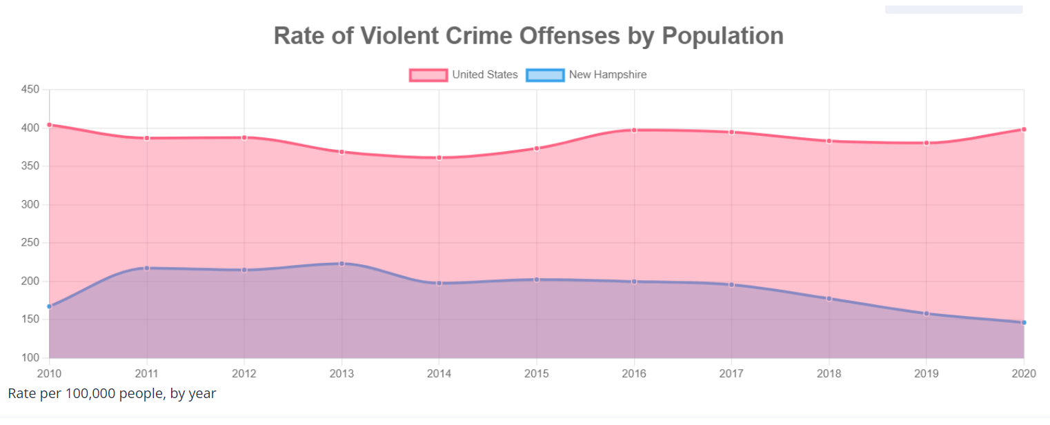 FBI year-over-year statistics show violent crime in New Hampshire well below the national rate. In New Hampshire in 2020, there were 146.5 violent crimes per 100,000 in population, compared to 398.5 nationally. But the agency cautions against making regional comparisons.