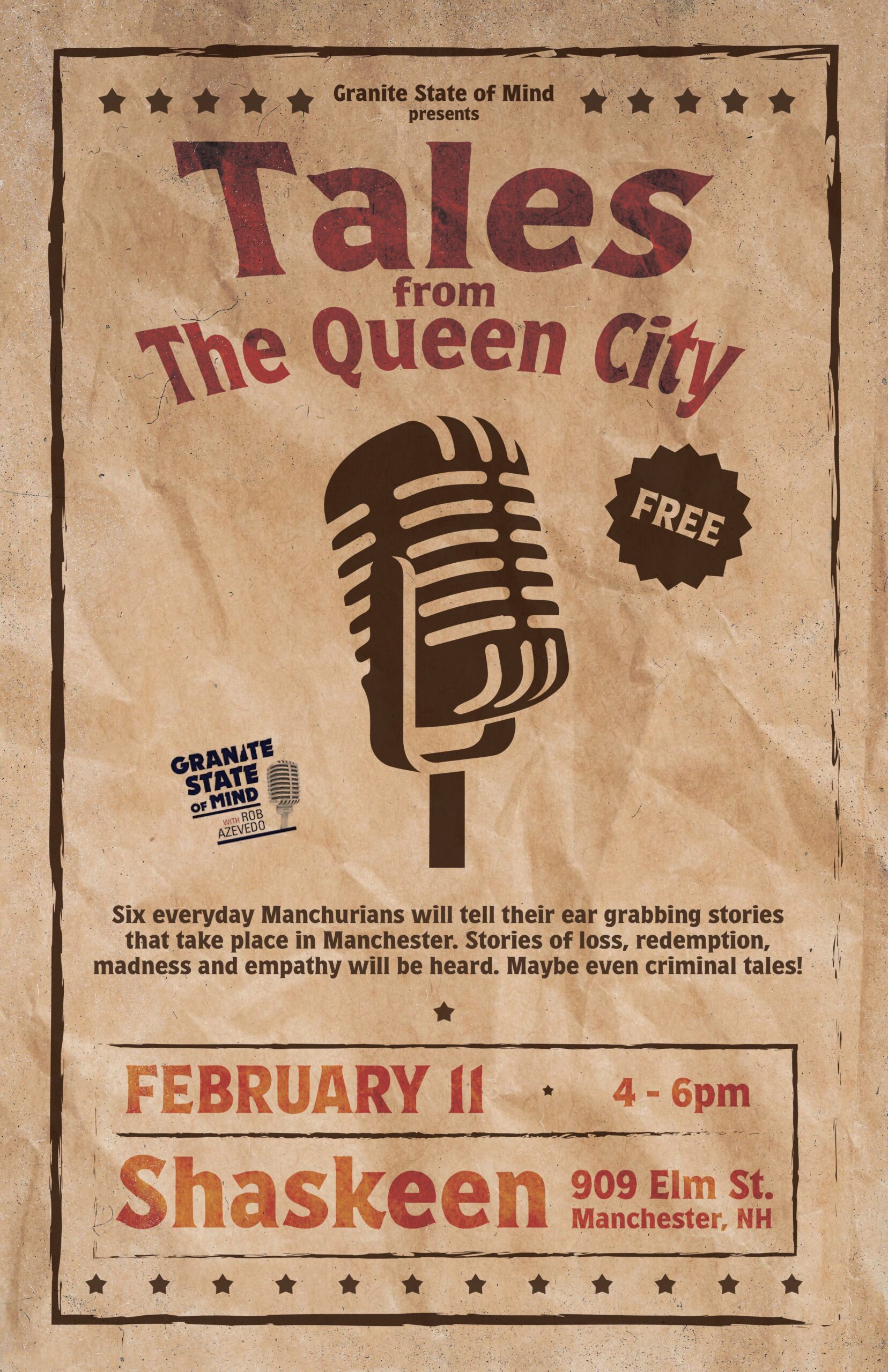 Now Rob Azevedo—the gregarious host of “Granite State of Mind” on WMNH 95.3 and resident guru of all things in the region—is harvesting said talent and seeking other Manchester-based storytellers to come forward for an evening of live stories involving The Queen City.