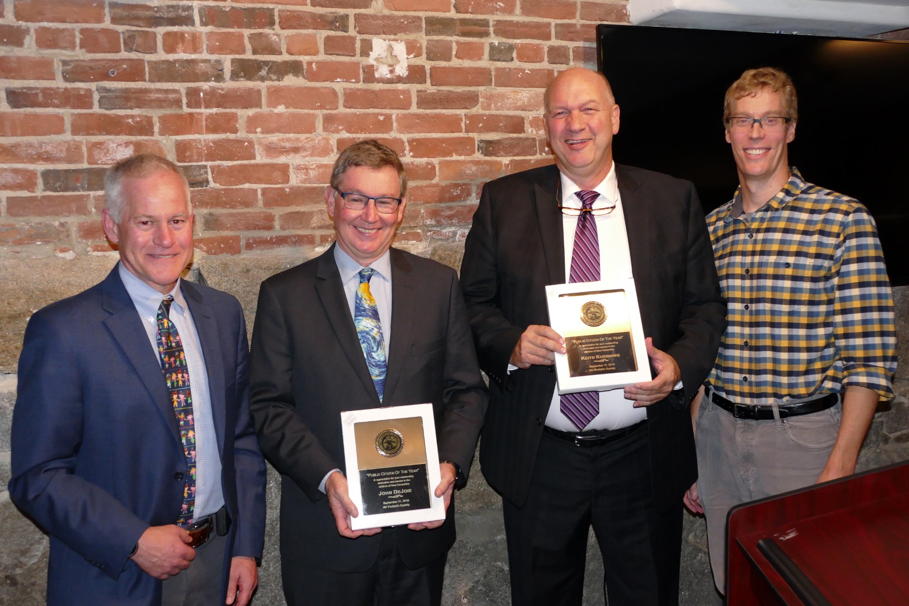 The award was presented by Eric Shessler, VP of NH Chapter of the American Academy of Pediatrics, who said that the 2018-2019 legislative year was “the year of the child…with significant advancements in child safety, health, well-being.”  He highlighted Kuenning and DeJoie’s reputation for coalition building and for basing their positions on evidence, and praised their “conscientious, tireless work to educate our lawmakers on what its important.”