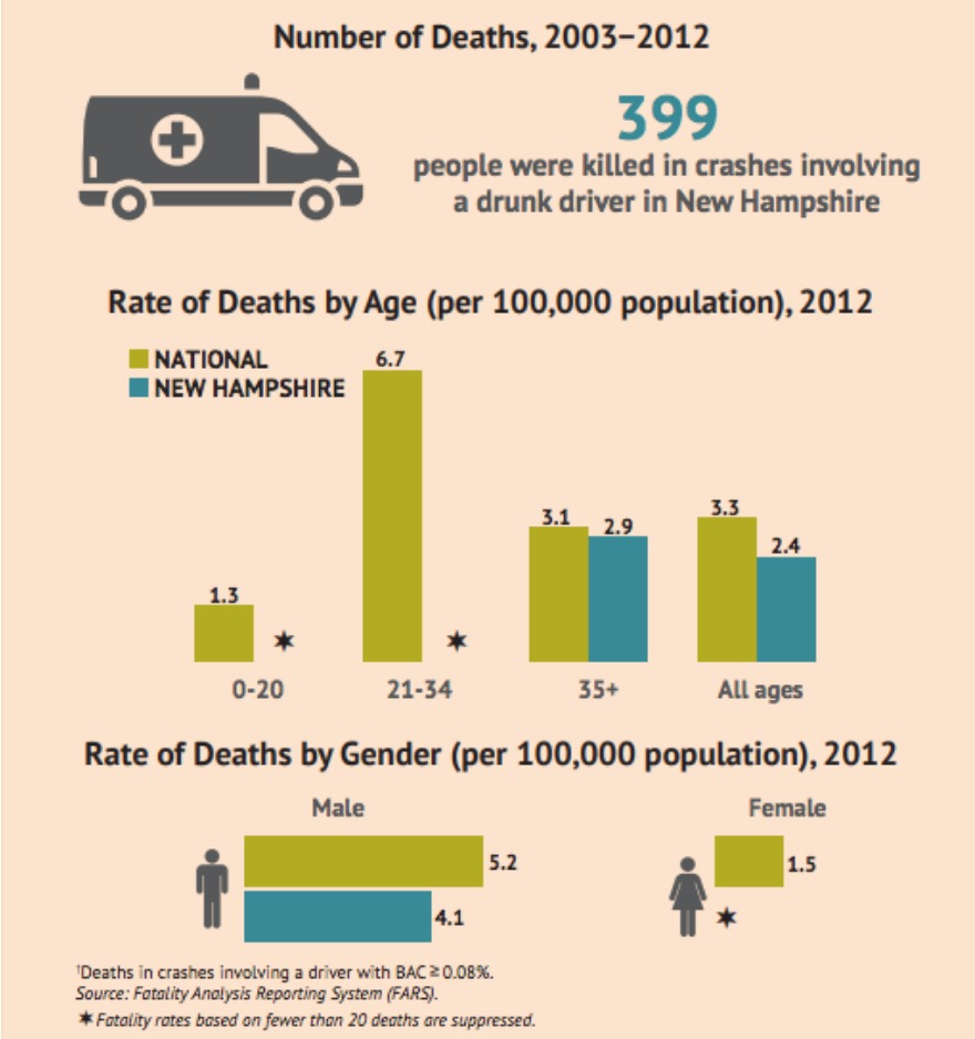 Although there were only 399 fatalities in New Hampshire from drunk driving between 2003 and 2012, the rate of deaths by age were significantly higher among those aged 21-34.