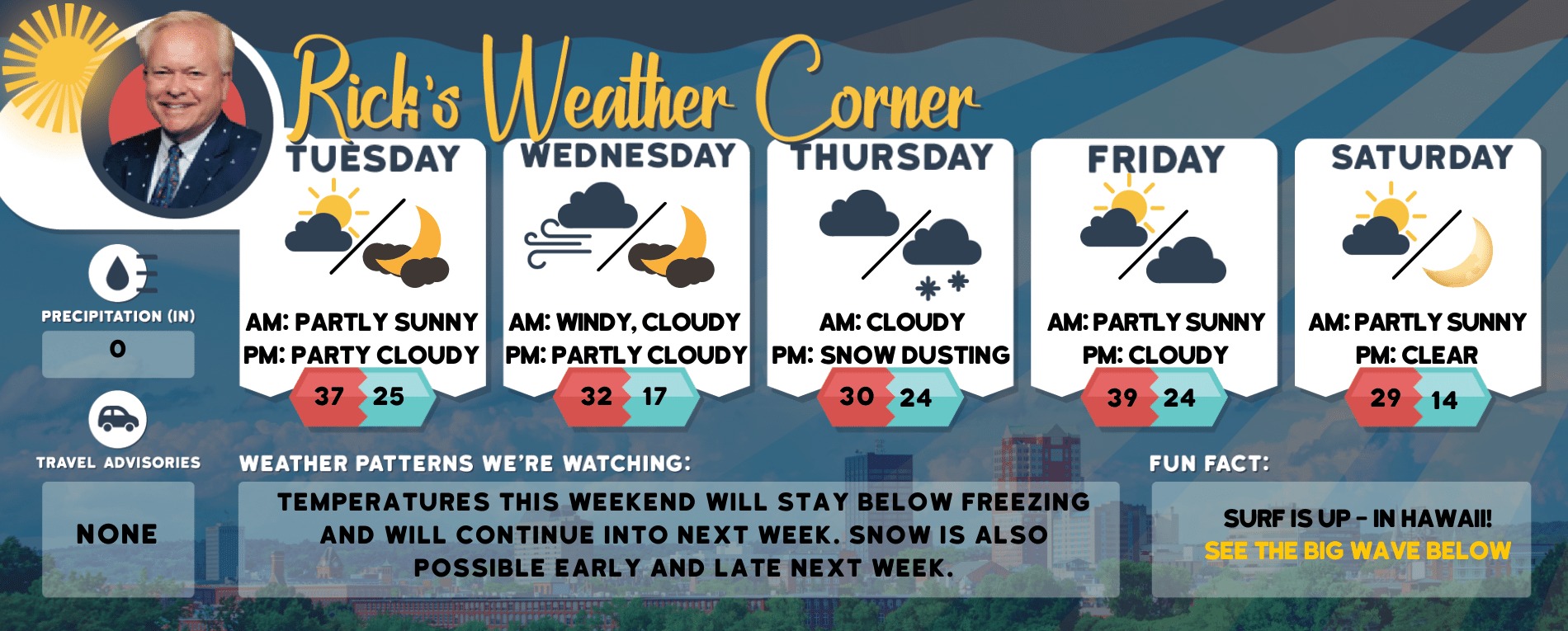 Saturday: Mix sun & clouds and colder High 29 (feel like 19) Winds: NW 10-20+ mph