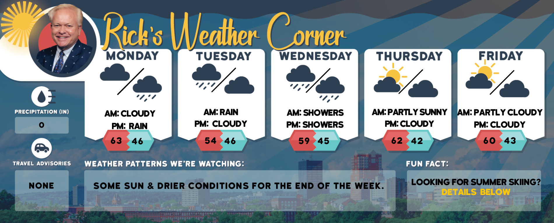 Wednesday: Cloudy with rain High 59 Winds: ENE 5-10 mph