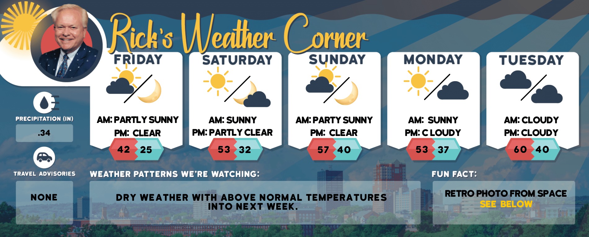 Today we will see the pressure gradient between the low to our northeast and high pressure to our west gradually lessen, allowing the northwest winds to diminish late this afternoon. High temperature today in the low 40s with it feeling like 34. Easter weekend temperatures will warm into the 50s.