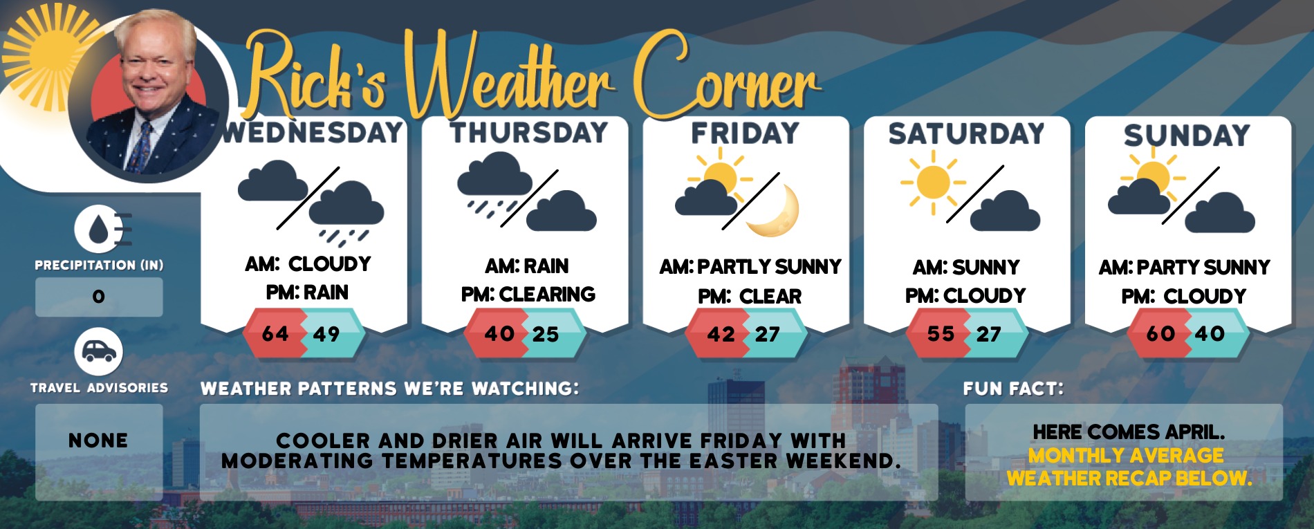 Easter Sunday: Mix sun & clouds High 60 Winds: NW 10-15 mph