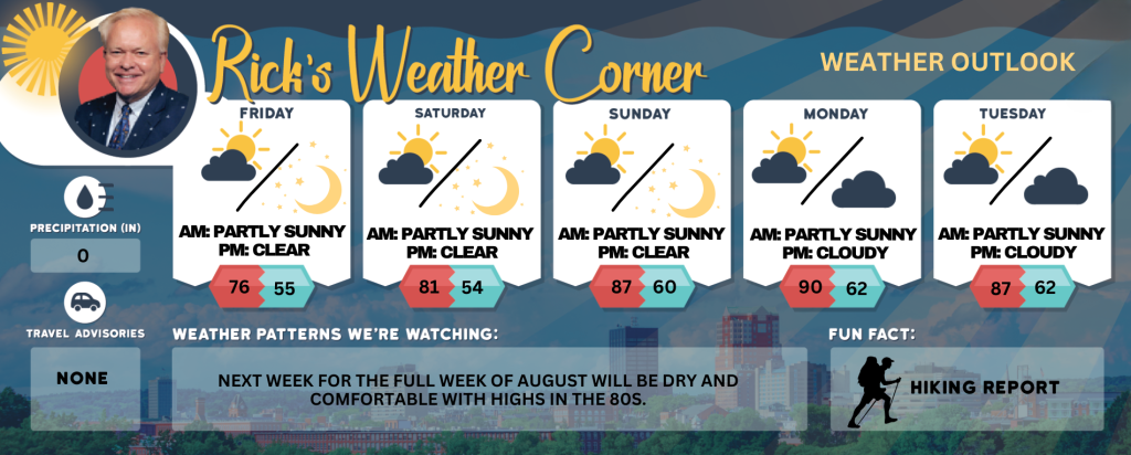 Next week for the full week of August will be dry and comfortable with highs in the 80s.