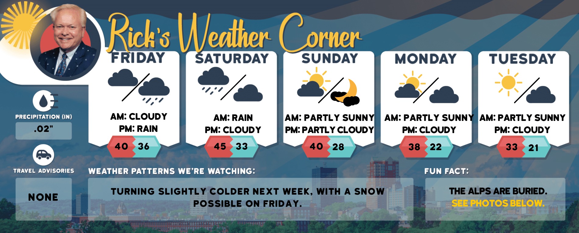 Monday: Mix sun & clouds High 38 Winds: WNW 5-15 mph