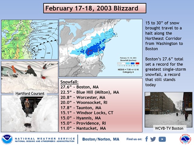 On This Day in Weather History: February 17-18, 2003 Blizzard conditions were reported throughout much of the mid-Atlantic states and into southern New England. Boston’s snowfall total of 27.6 inches set the record for the greatest single-storm snowfall, which still stands today.