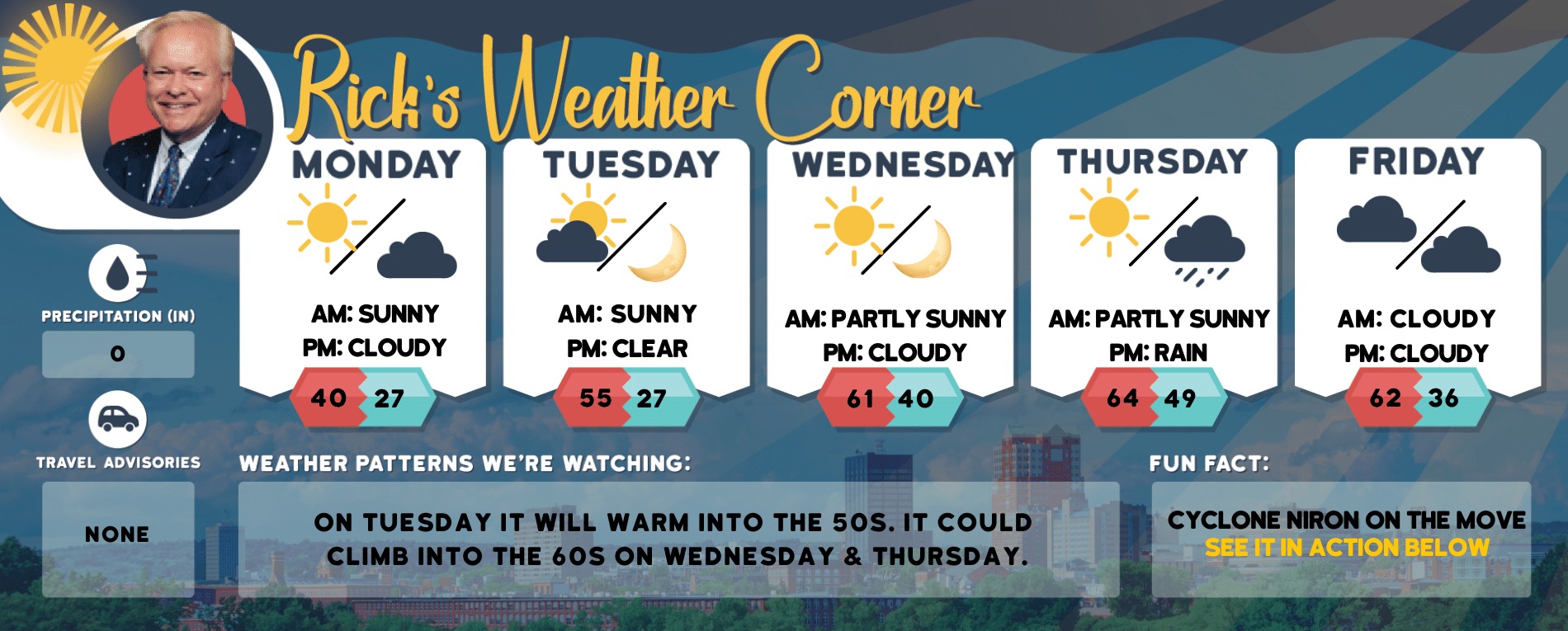High pressure builds in from the west, giving us mostly sunny conditions. Temperatures will not be as cold as over the weekend. A warming trend will start today and continue into the second half of the week.