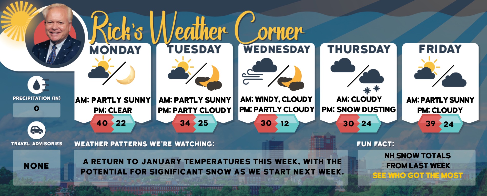 A weak disturbance moves in for Martin Luther King Day with a mix of sun & clouds. Temperatures will remain above normal with a chilly breeze making it feel like 32.
