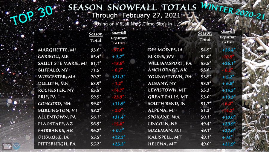 Marquette takes the lead for the first time but still well below normal. Caribou moves into second. Worcester holding onto Top 5. Concord breaks the top 10 at 9th.