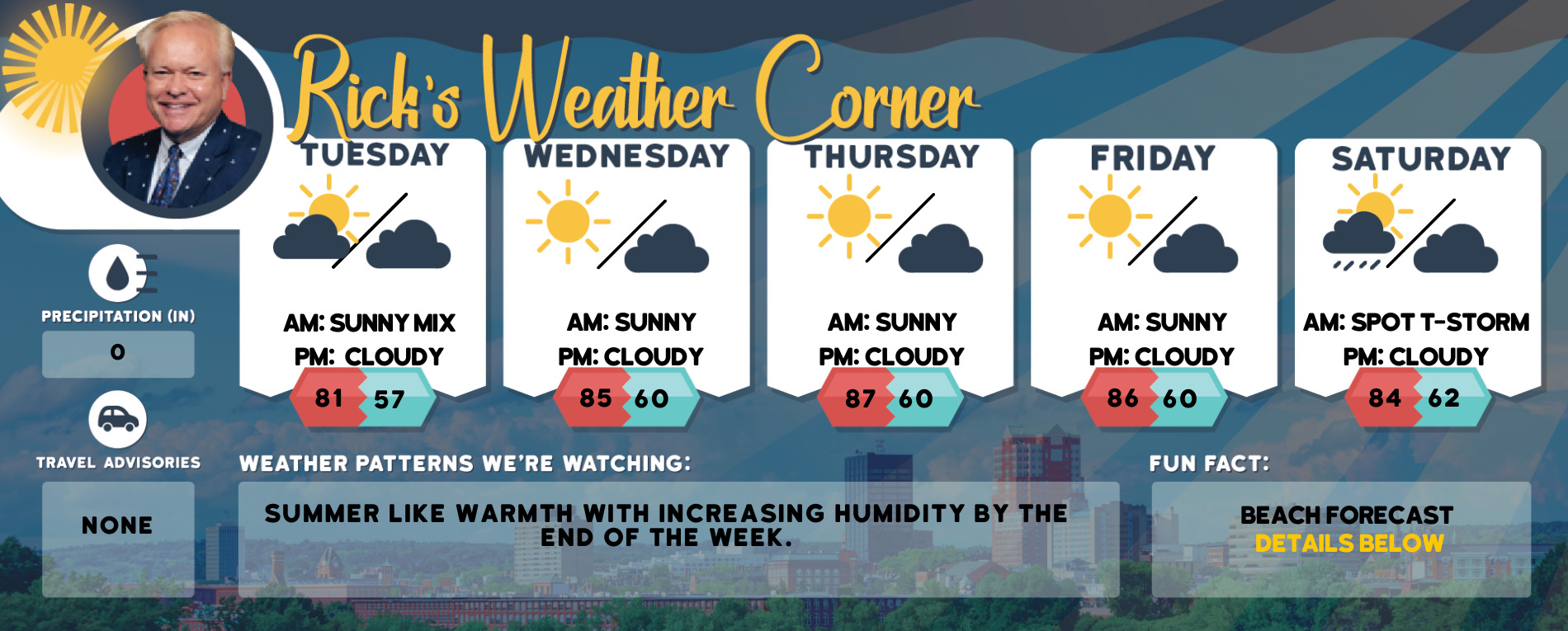 Wednesday: Some sun & very warm High 85 Winds: NNW 5-10 mph