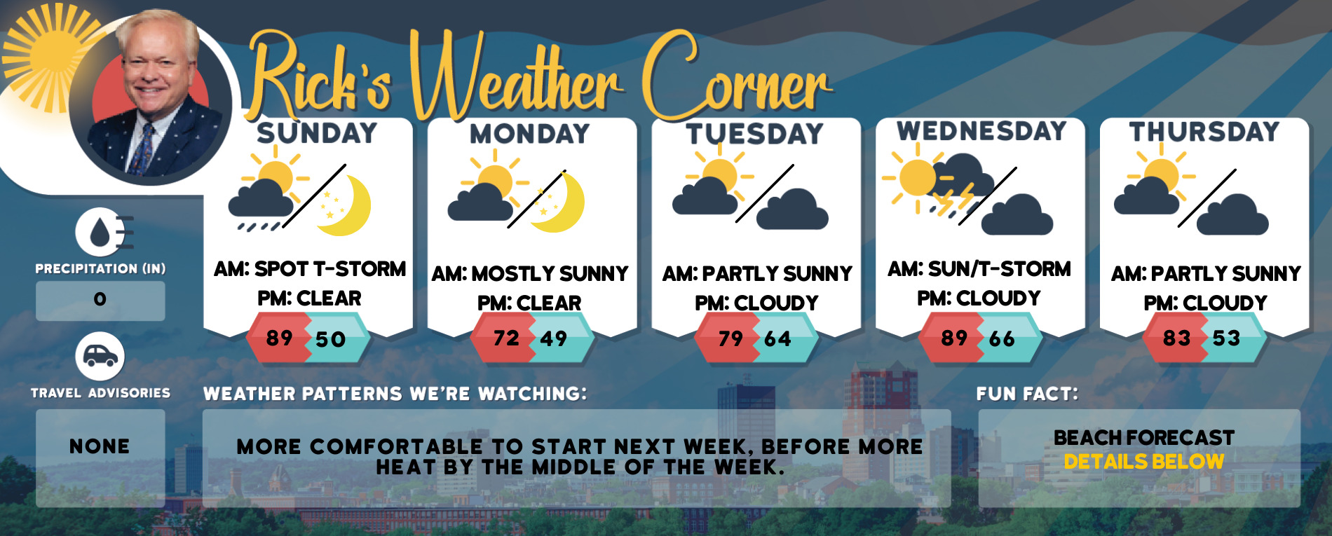 - Weather Outlook: Lots of sun, spot late day thunderstorm.