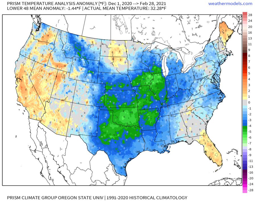 A Look at Climatological Winter (Dec, Jan, Feb) Climatological Winter (Dec, Jan, Feb) finished -1.44 degrees F below average for the US.