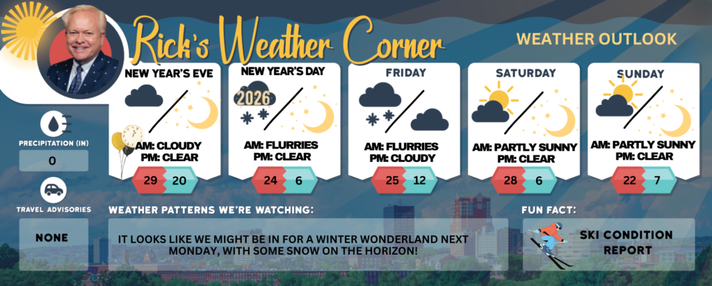 New Years Eve: Partly cloudy with a few flurries and cold; bundle up for New Year’s Eve festivities. Low 20 (feel like 13) Winds: SSW 5-10 mph