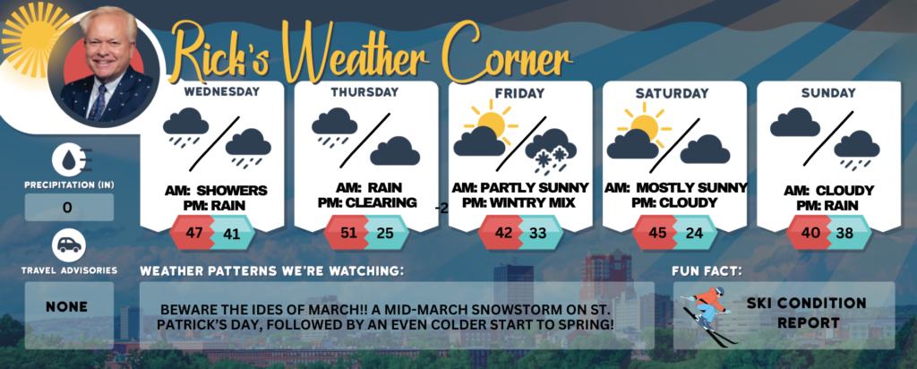 Yesterday’s high of 74 degrees beat the old record of 68 set in 2016. Today will be more than 20 degrees cooler, yet still warmer than the normal high of 43. Expect cloudy, cooler conditions with occasional afternoon showers totaling about 0.10 inches. High near 47 (feels like 44) with east winds at 5–10 mph.