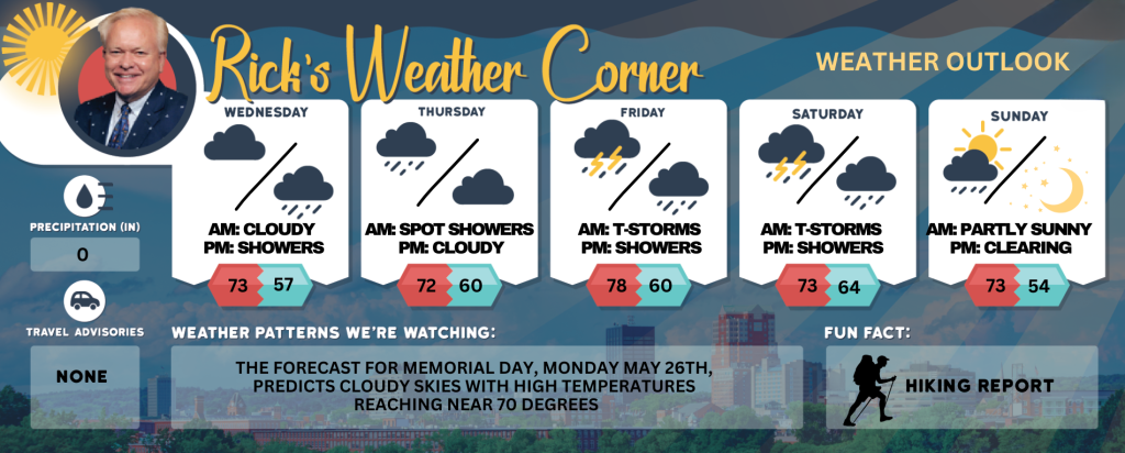 The forecast for Memorial Day, Monday May 26th, predicts cloudy skies with high temperatures reaching near 70 degrees.