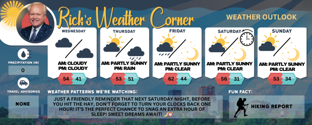 Thursday: Cloudy and windy with occasional afternoon showers (0.25″); fallen leaves combined with rainfall may cause slick roads and clogged storm drains. High 53 (feel like 43) Winds: ENE 15-20+ mph