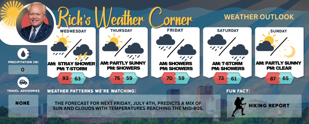 Sunday: Warmer more humid with some sun & clouds. High 87 (feel like 89) Winds: W 5-15 mph