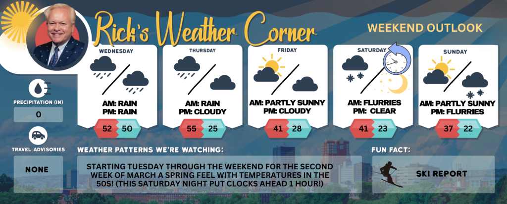 Starting next Tuesday through the weekend for the second week of March a spring feel with temperatures in the 50s! (This Saturday night put clocks ahead 1 hour!)
