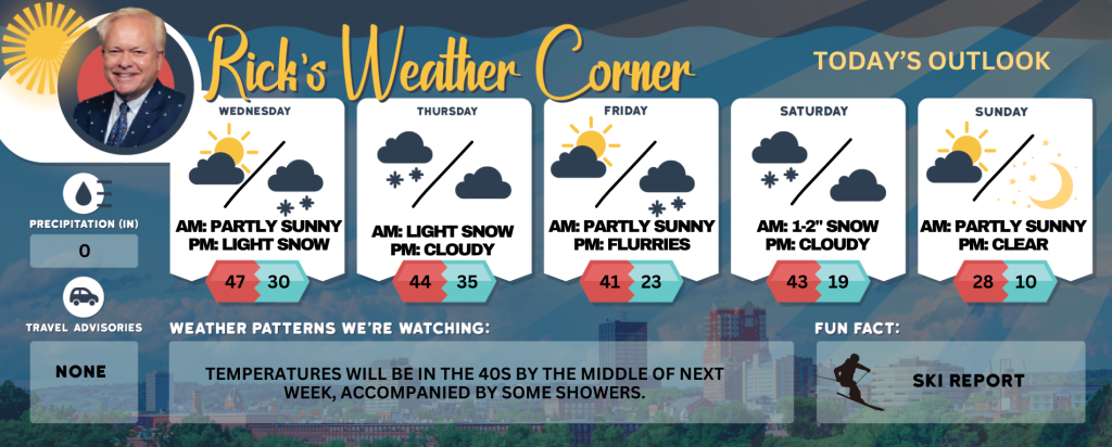 Thursday: Cloudy & windy with early morning light snow to showers. High 44 (feel like 35) Winds: ESE15-20+ mph