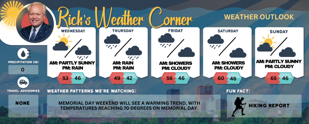 Memorial Day weekend will see a warming trend, with temperatures reaching 71degrees on Memorial Day.