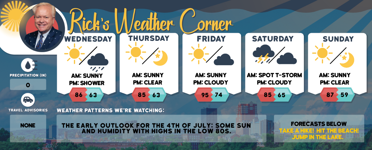 High pressure builds in from the south with a warming trend expected through the week. The peak of the heat is likely on Friday with highs in the mid-90s with increasing humidity.