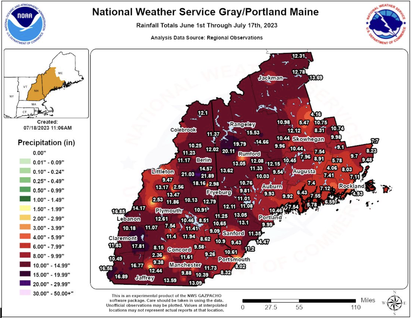 While the entire area is experiencing precipitation totals well above normal, there are places in New Hampshire that have received 200-300% of normal. We are expecting thunderstorms yesterday afternoon and evening that will add to the totals in some locations.